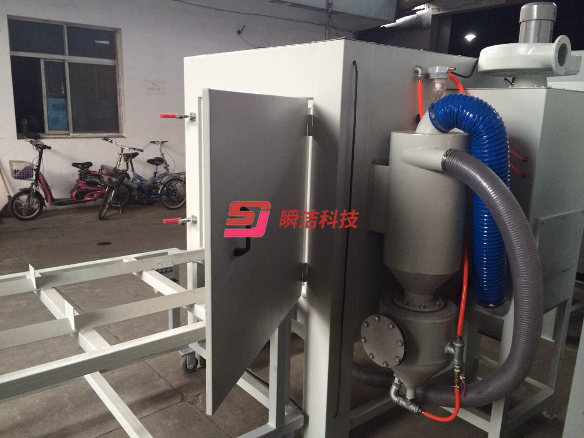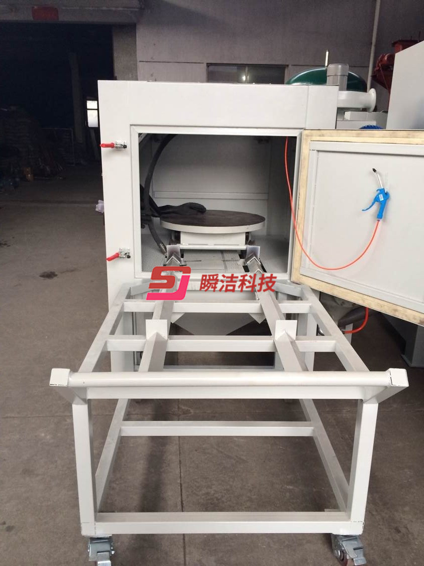 、配備活動臺車,和轉盤,操作時將工件放在轉盤上,然后推入機內即可噴砂作業,操作簡單省力。